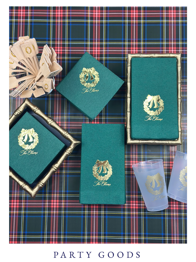 These festive essentials are more than just practical—they set the tone, spark conversation, and show your guests that every detail was thoughtfully planned. Pro tip: plan for about three napkins per guest to keep up with all the toasts, treats, and happy little messes along the way.